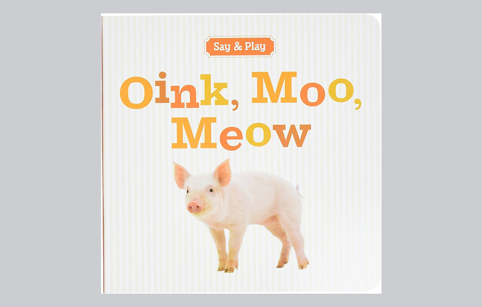 Explore the book together. Let your baby hold the book. Talk about the picture on the front cover and read the title by making the animal sounds.